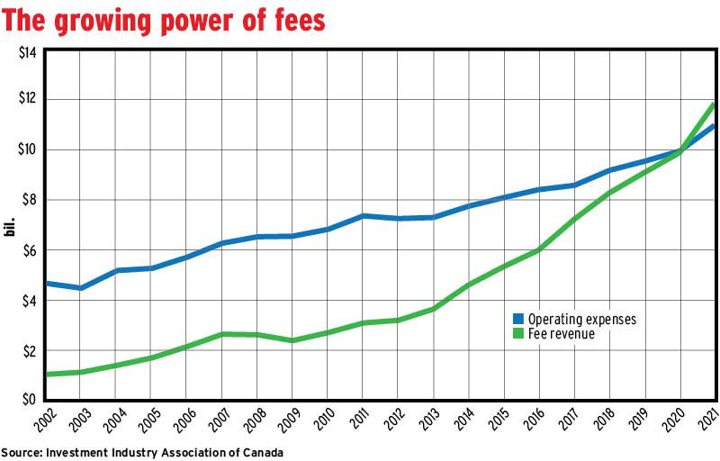 Commission revenue grew even faster than fees. Annual commission revenue (excluding mutual fund commissions) topped $4.4 billion in 2021, the IIAC reported, up from just over $3 billion in 2019.